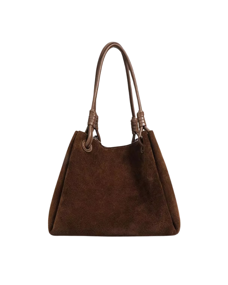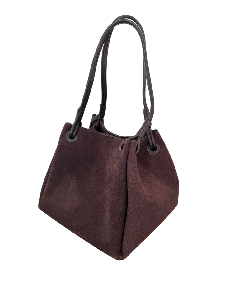 Crafted from genuine suede, the Sloane Mini Bucket Bag blends timeless elegance with everyday practicality. Its soft, structured silhouette is complemented by supple leather handles and a warm deep-mocha hue, creating an understated yet elevated finish.