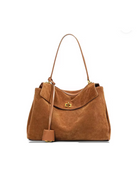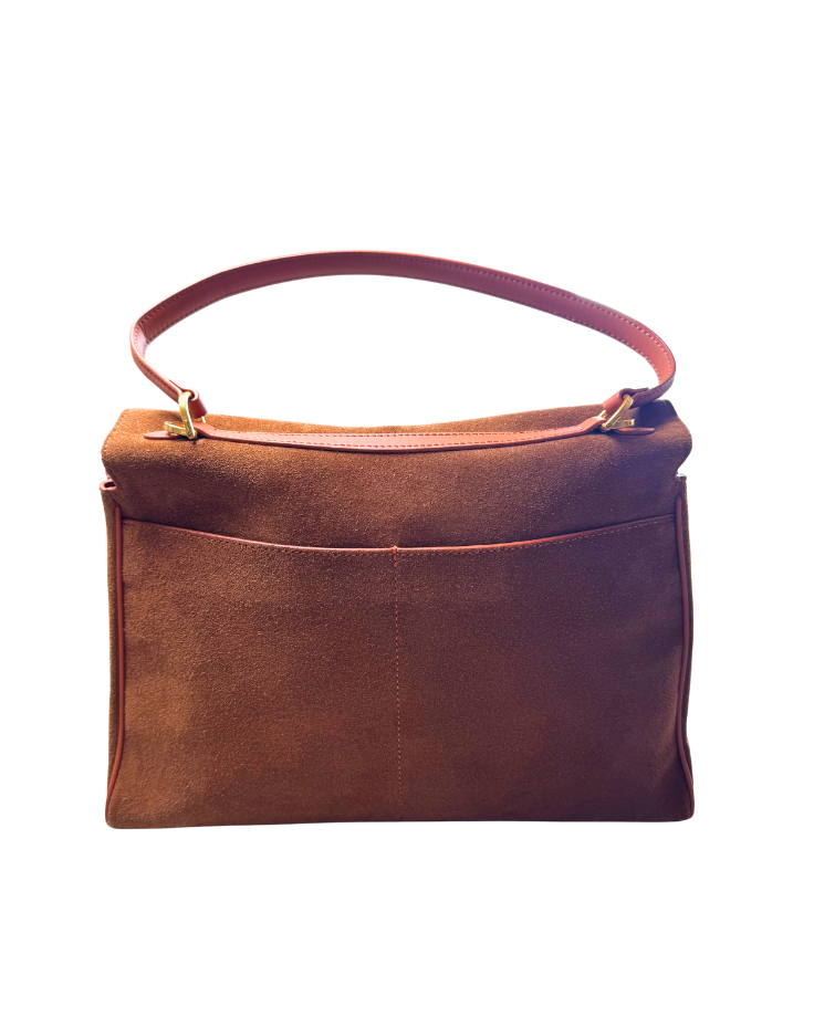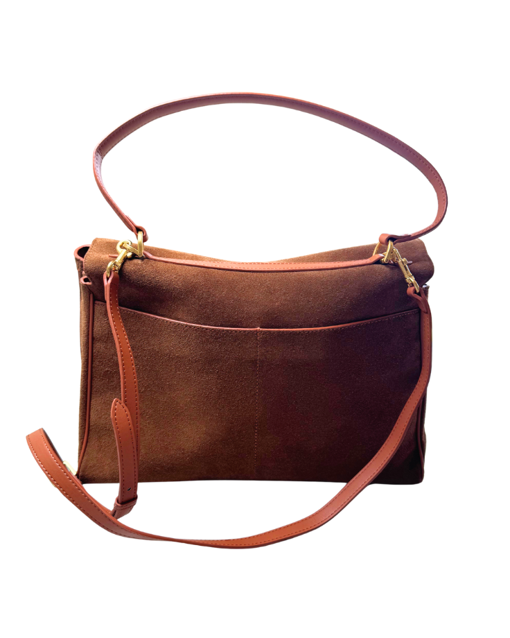 Crafted in rich latte suede and trimmed with smooth tan leather, the Solène Tote balances structure with softness. Its generous interior and minimalist silhouette make it the perfect companion for elevated daily wear from weekday meetings to weekend escapes. Finished with polished gold hardware and an elegant top handle for effortless shoulder or arm carry.